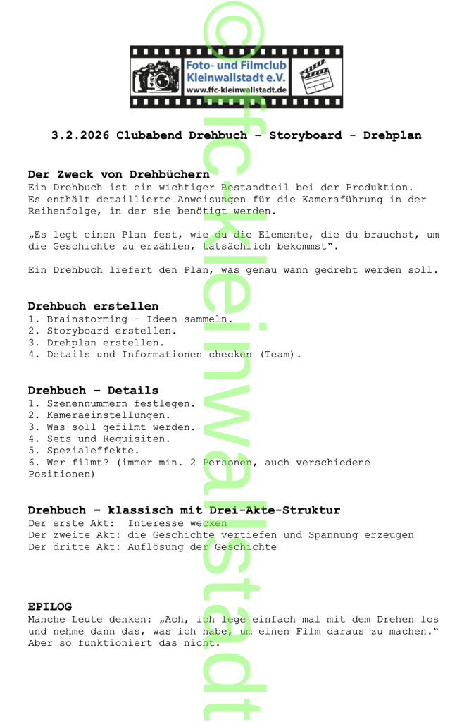 Clubabend am 03.02.2026: Drehbuch – Storybord – Drehplan (Harald)